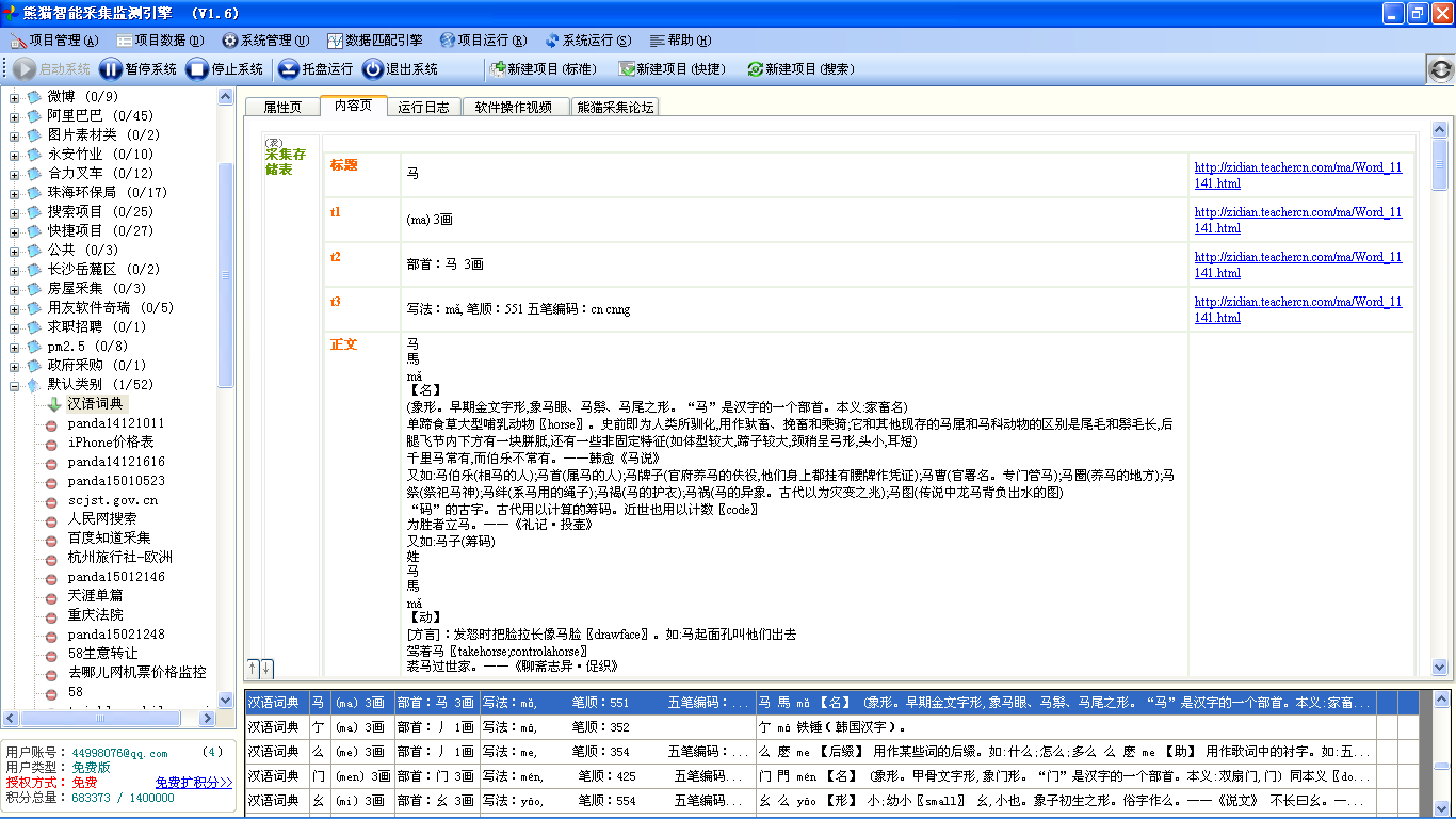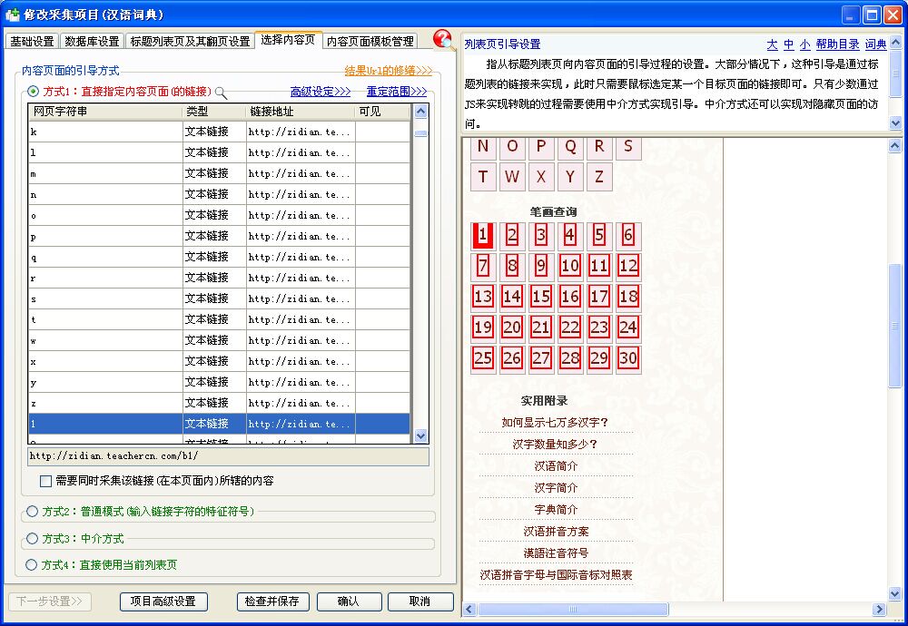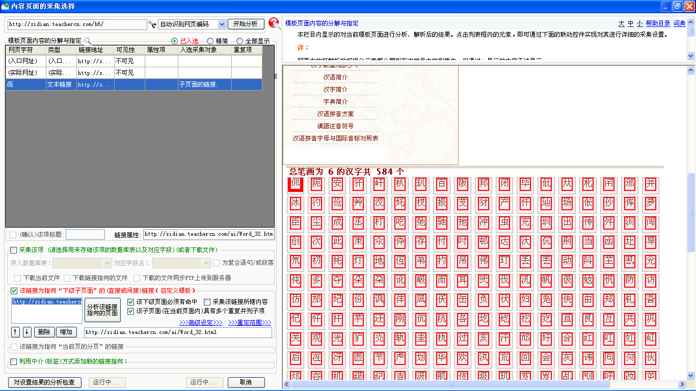 即可访问该二级标题列表页面中所列的所有字,然后点击“分析该链接指向的页面”按钮,进入最终的内容页面,按需要进行采集设置即可。